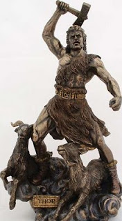 During a thunderstorm Thor is believed to be riding through the heavens on his chariot which is pulled by two goats. Lightning flashes each time he throws his mighty hammer Mjollnir. He wears a belt which doubles his already amazing strength and wears a pair of iron gloves which are needed to hold his hammer. The fourth day of the week, Thursday is derived from his name.